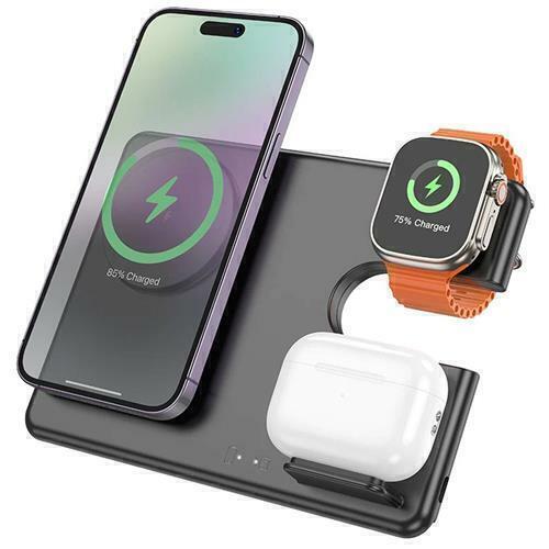 El Hoco CQ1 Cargador Geek Folding 3 in 1 Inalámbrico Iwatch Negro es una solución de carga magnética inalámbrica súper rápida de 15W compatible con iPhone 14/13/12, que también permite cargar iWatch y Airpods al mismo tiempo.